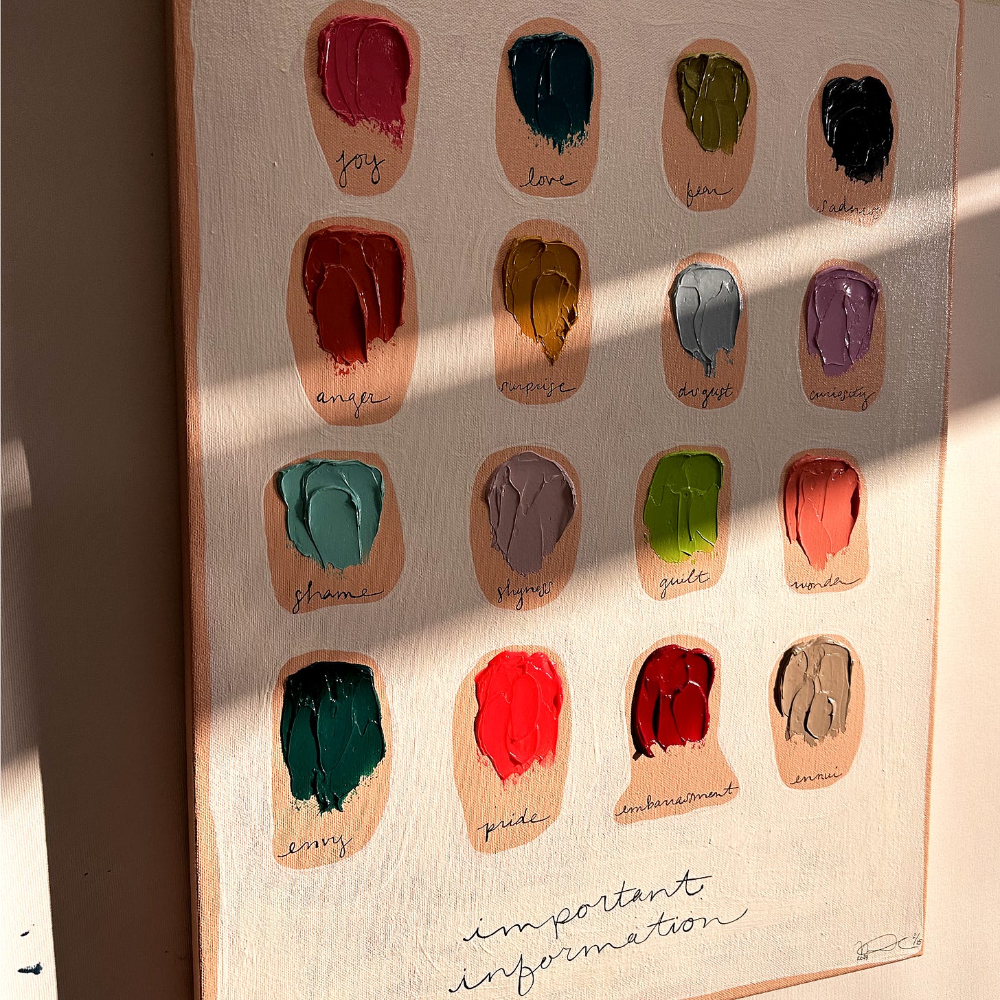 “It’s important information” is something I (probably annoyingly) say in my therapy space to clients often. The first work I created like this is on my wall and often referenced in stuck moments. Emotions frequently get assigned negative or positive, but every single one is meaningful and important, not “good” or “bad”. Each acts as the body and mind’s signals to help you human. Angry? May be an important sign of a boundary that’s been violated or an indicator for justice. Disgusted? That may be an internal cue that whoever gives you that feeling doesn’t need your time or connection. Filled with Awe or Wonder? Whatever brings you this feeling must be pursued and repeated for a life of vitality.